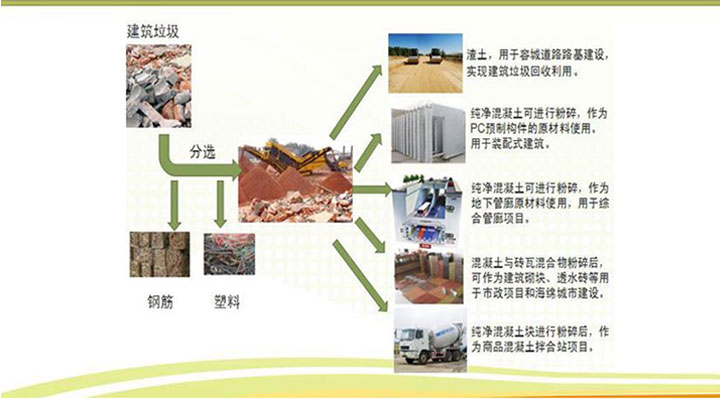 建筑垃圾处理,是将固体废弃物作为再生资源重新利用的一种方式。建筑垃圾中的许多废弃物经分拣、剔除或粉碎后,大多可以作为再生资源重新利用如:废钢筋、废铁丝、废电线和各种废钢配件等金属,经分拣、集中、重新回炉后,可以再加工制成各种规格的钢材;废竹木材则可以用于制造人造木材;砖、石、混凝土等废料经粉碎后,可以代砂,用于砌筑砂浆、抹灰 砂浆、打混凝土垫层等,还可以用于制作砌块、铺道砖等建材制品。