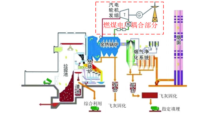 新建垃圾焚烧线,通过余热锅炉产生的蒸汽进入燃煤电厂热力系统耦合发电,不新建汽轮发电机组及辅助设备,只配置除氧给水、回热等系统,同步建设脱硫、脱硝、除尘、二噁英及垃圾渗滤液处理等环保治理设施。
